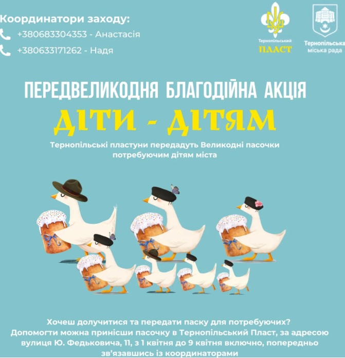 Сьомий рік поспіль тернопільські пластуни спільно з управлінням сім’ї, молодіжної політики та захисту дітей міської ради проводять передвеликодню благодійну акцію «Діти – дітям», щоб підтримати тих, хто цього потребує.