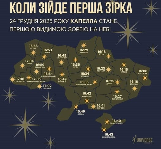 #-ГОЛОВНІ НОВИНИ #-ГОЛОВНЕ #-СЛАЙДЕР Новини Тернопілля Цікавинки Коли над Тернопільщиною зійде перша різдвяна зоря Антоніна Коляда 24 Грудня, 2025 1 min read 111 Поширити це: Натисніть щоб поширити через Facebook (Відкривається у новому вікні) Facebook Натисніть, щоб поширити у X (Відкривається у новому вікні) X Натисніть, щоб надрукувати (Відкривається у новому вікні) Друк Капелла стане сьогодні, 24 грудня, першою видимою зорею на небі. Найраніше зорю Капеллу побачать на Луганщині о 16:08. У Києві – о 16:36. У Тернополі першу різдвяну зірку можна буде побачити о 16:59.Подобається це:Подобається Завантаження… Continue Reading Previous: «3000 км Україною»: скільки людей уже подорожують безкоштовноNext: 12 унікальних природних пам’яток Чортківської громади отримали межі та охоронний статус Залишити відповідь Скасувати коментарВаша e-mail адреса не оприлюднюватиметься. Обов’язкові поля позначені *Коментар * Ім'я * Email * Сайт Зберегти моє ім'я, e-mail, та адресу сайту в цьому браузері для моїх подальших коментарів. Δ
