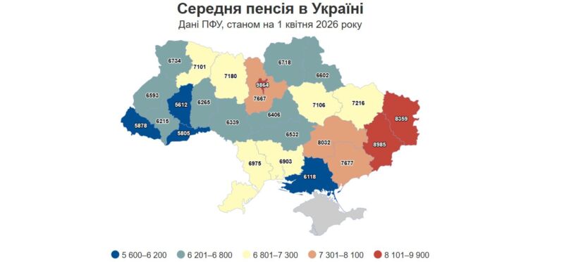 Найвищі пенсії традиційно у Києві – в середньому, 9 864 гривні. Найнижчі – на Тернопільщині, де середня виплата становить 5 612 гривень.