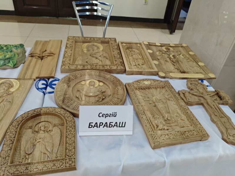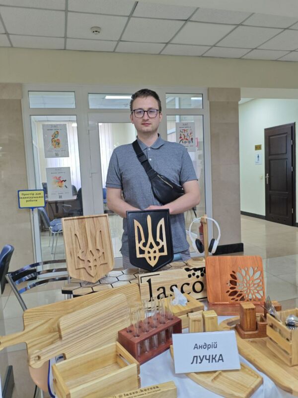 Родина військовослужбовця Андрія Лучки понад 10 років займається виготовленням виробів з дерева. Започаткував цю справу батько чоловіка, який у 2022 році став на захист України. Андрій, який служить в ЗСУ з вересня 2024 року, зараз перебуває у відпусті і прийшов разом з дружиною презентувати продукцію.