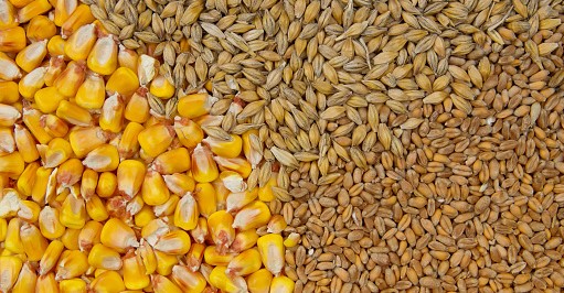 Wheat, barley and maize grains as agricultural background.
