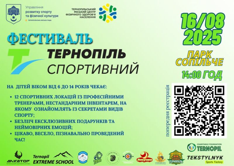 16 серпня 2025 року в парку «Сопільче» (центральна алея) відбудеться масштабний фізкультурно-оздоровчий фестиваль «Тернопіль спортивний». Захід організований для дітей віком від 6 до 14 років і має на меті популяризацію активного способу життя та знайомство з різноманітними видами спорту.