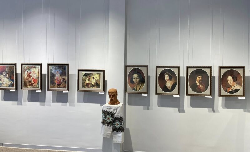 Серед них – ліногравюри заслуженого художника України Ярослава Омеляна («Тарас Шевченко», «Т.Шевченко в Кременці»), живописні полотна народного художника України Богдана Ткачика («І на оновленій землі…», «Думи мої, думи мої…»), унікальні краєвиди з місць заслання Т.Шевченка – «Мангишлацький пейзаж», «Форт Шевченко», «Залишки Новопетрівського укріплення Хівінського шляху» Андрія Ткаченка, які він намалював у 1962-63 рр., перебуваючи у Казахстані. Привертає увагу портрет молодого Т.Шевченка пензля Мирона Федчини.