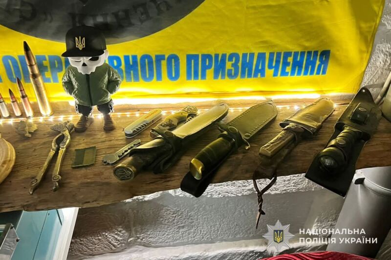 Під час огляду гаражного приміщення поліцейські виявили заборонені предмети, зокрема, патрони, порох, ножі а також суху подрібнену речовину, схожу на наркотичну.