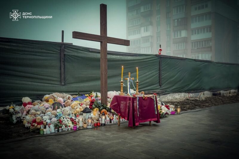 Сьогодні в Тернополі відбулося освячення пам’ятного Хреста на місці зруйнованого будинку на вулиці Василя Стуса, який постраждав від ворожої ракетної атаки місяць тому.