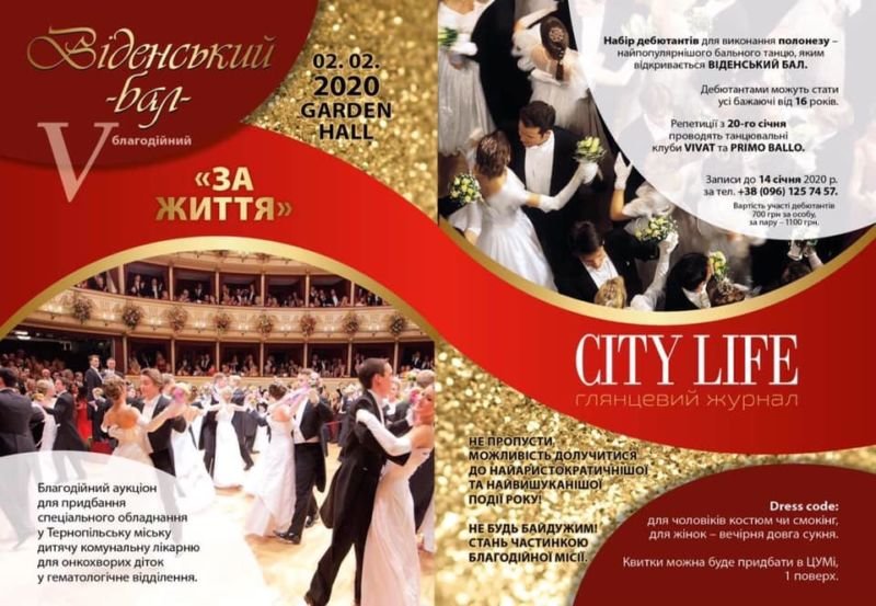 У Тернополі, за підтримки міського голови Сергія Надала, 2 лютого пройде V Благодійний Віденський бал, який влаштовує для місцевої громади редакція журналу City Life. Захід відбудеться в залі готельно-ресторанного комплексу «Garden Hall».