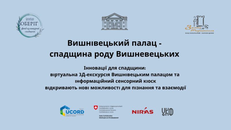 Команда ГО «Фонд культурної спадщини «Оберіг» та НЗ «Замки Тернопілля» продовжує реалізацію проєкту «Вишнівецький палац – спадщина роду Вишневецьких», що втілюється за підтримки Українського культурного фонду та програми UCORD «Партнерство для розвитку» (лот 2 «Згуртованість через культуру»).