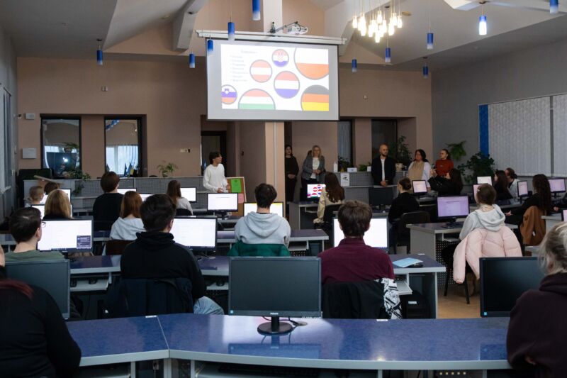 Студенти освітньо-професійної програми «Бізнес-комунікації та переклад» Андрій Стравський і Кароліна Понікарчик представили учням профорієнтаційну презентацію про спеціальність «Філологія». Вони ознайомили школярів з особливостями професії, широкими кар’єрними перспективами та розповіли їм про переваги навчання за цією програмою.