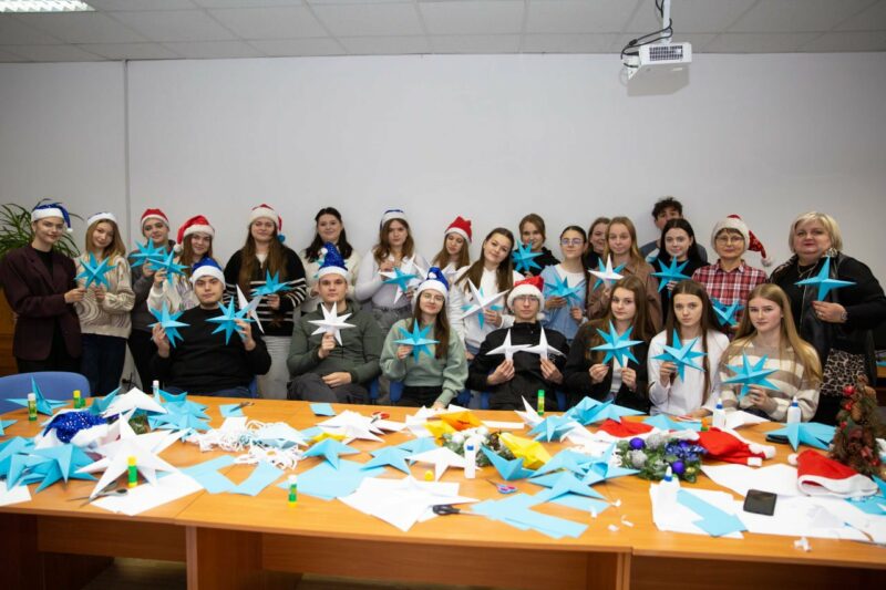 Під керівництвом майстрині народних художніх промислів, фахівчині відділу творчої самореалізації та виховання Марії Гайди відбулася перша зустріч, на якій студенти вчилися власноруч виготовляти різдвяні зірки – символ світла, надії та народження Христа.