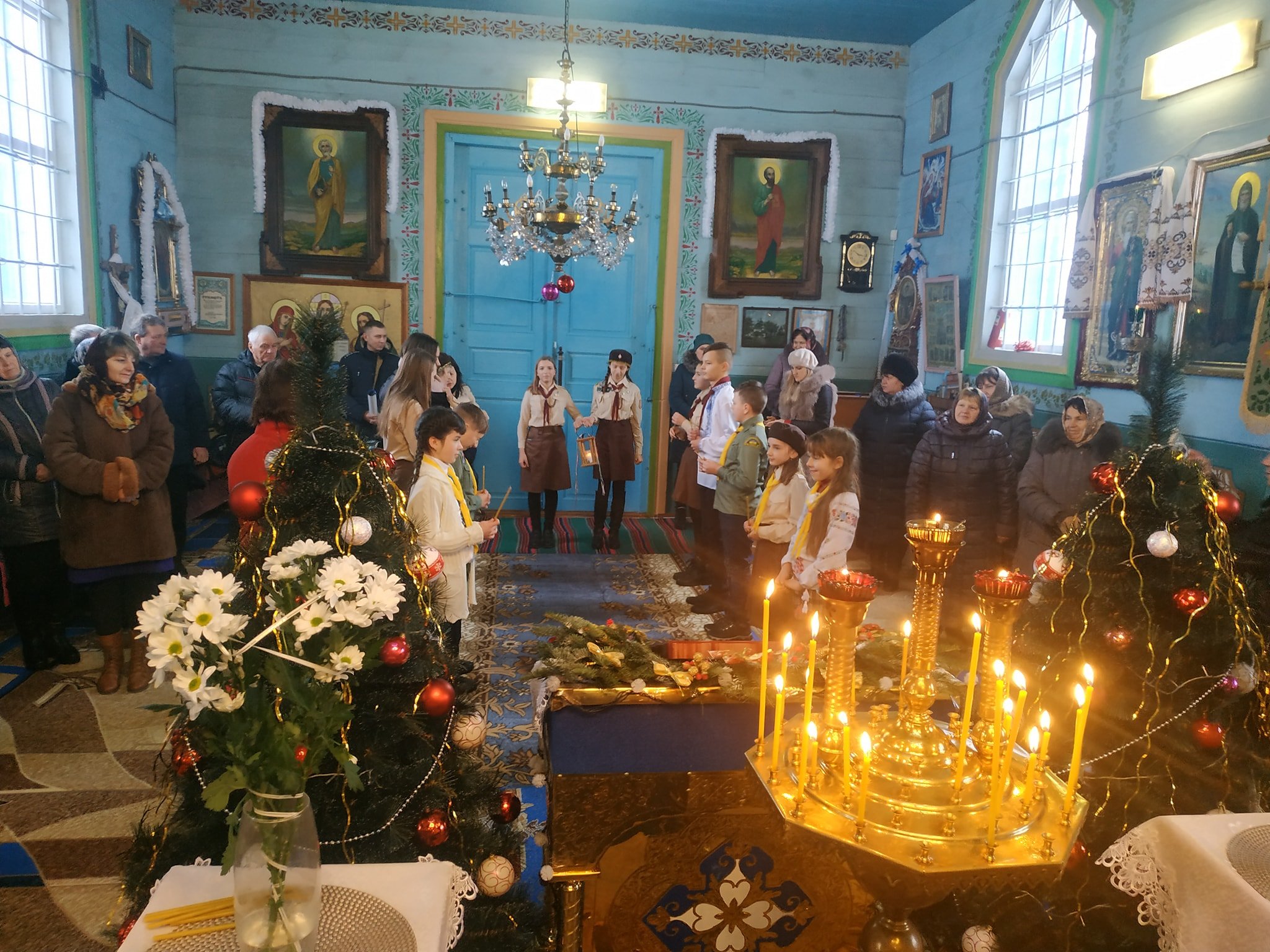 Вифлеємський вогонь сяє і в храмі Покрови Божої Матері Православної Церкви України села Кордишів на Шумщині. Його передали настоятелю храму о.Василю пластуни шумської станиці.