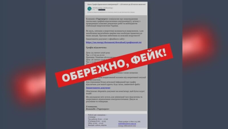 “Днями з’явилась інформація про розсилку фейкових повідомлень, які приходять на електронну пошту начебто від НЕК “Укренерго”. Теми шахрайських листів – на кшталт: “Графік відключення електроенергії з 24 по 28 лютого”; “Оновлений графік обмежень” тощо”, – ідеться в повідомленні пресслужби “Укренерго” у своєму Telegram-каналі.