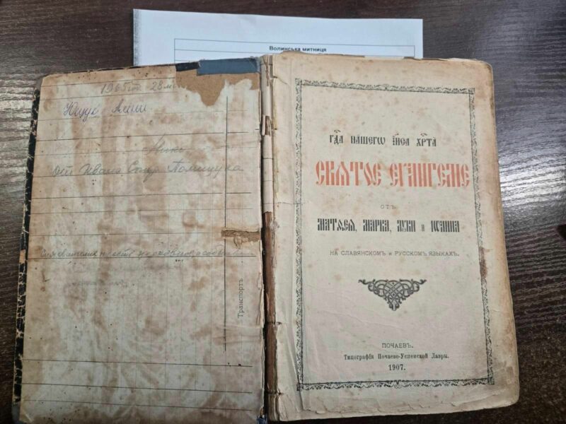 Книгу “Святоє Євангеліє Господа нашого Іісуса Христа от Матвея, Марка, Луки, Іоанна” було вилучено при перетині державного кордону Волинською митницею Державної митної служби України.